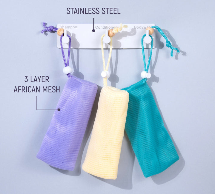 Stainless steel plate with 3 handy hooks & 3 foaming African mesh nets. Easy self-adhesive setup, no tools needed — strong enough to hold up to 1kg.