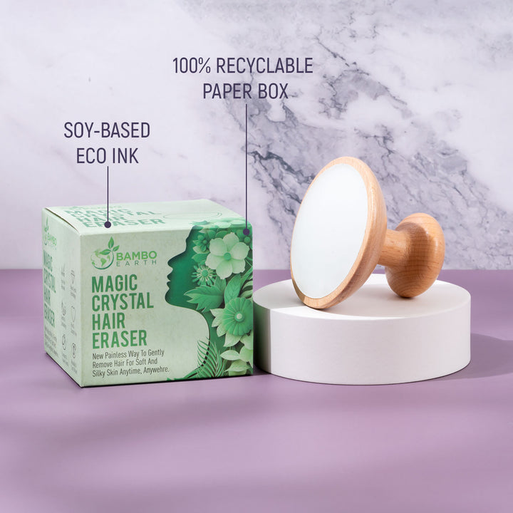 The tip features nano-crystal technology for effective hair removal. The handle is crafted from sustainable bamboo, offering a durable and eco-friendly grip.