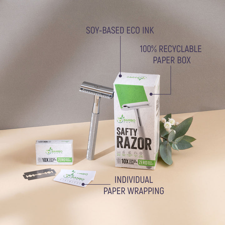 Level up your shaving game! Our Safety Razor comes loaded with 10 ultra-sharp stainless steel blades for a flawlessly smooth shave. Built with a non-slip design, it stays steady in your hand, even in the shower. Easy to assemble, effortless to use — and completely zero waste. No more ingrown hairs, no more plastic waste. Just pure shaving satisfaction.